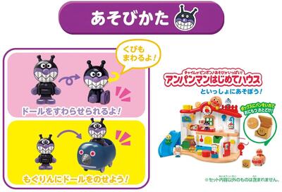 特徴 ・「アンパンマンはじめてハウスドールセット ばいきんまんとなかまたち」が登場! ・ドールは座らせたり、首を回したりできるよ! ・もぐりんにドールを乗せよう! ・ボックスにパンを入れておにもつおとどけ遊びが楽しめます! ・別売りのチャイムがピンポン♪